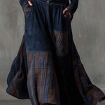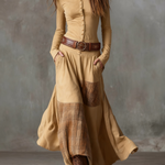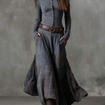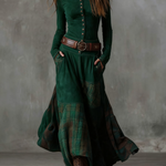 Ova prelepa maxi haljina kombinuje mekanu teksturu sa efektom antilopa i karirane panele, stvarajući neodoljiv vintage stil. Pripijeni gornji deo i lepršava suknja formiraju ženstvenu i profinjenu siluetu koja privlači sve poglede.